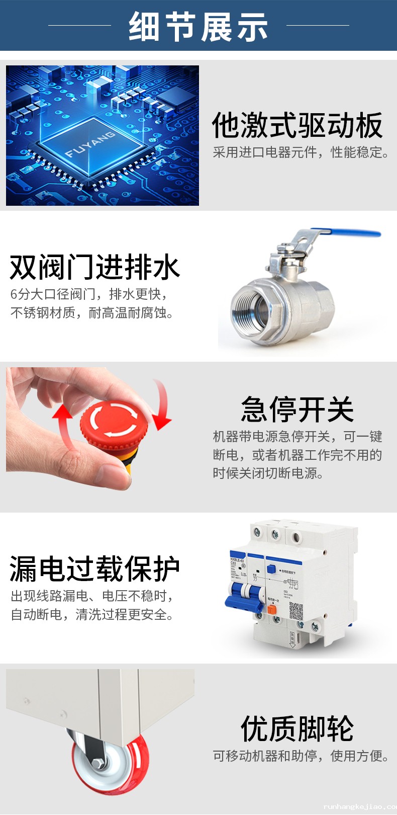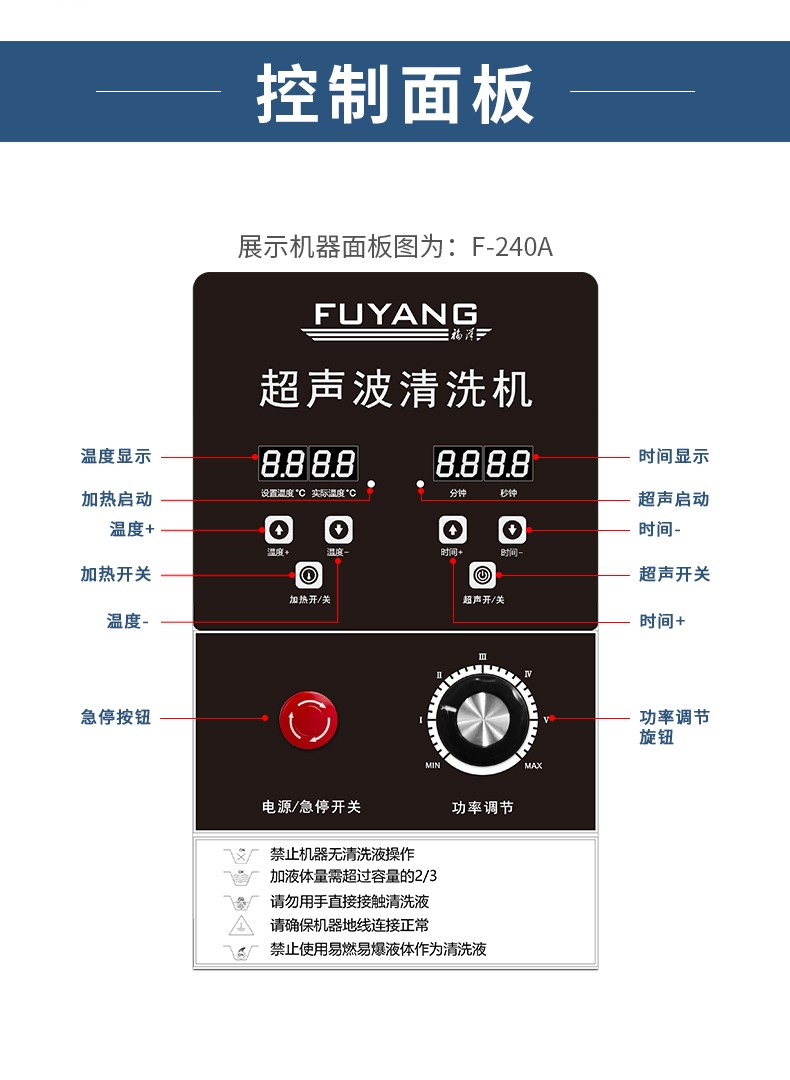 • 启动加热功能,清洗槽内液体不得低于清洗槽内槽高度的2/3;不开启加热功能,清洗槽内液体不得低于清洗植内精高段的1/2。
